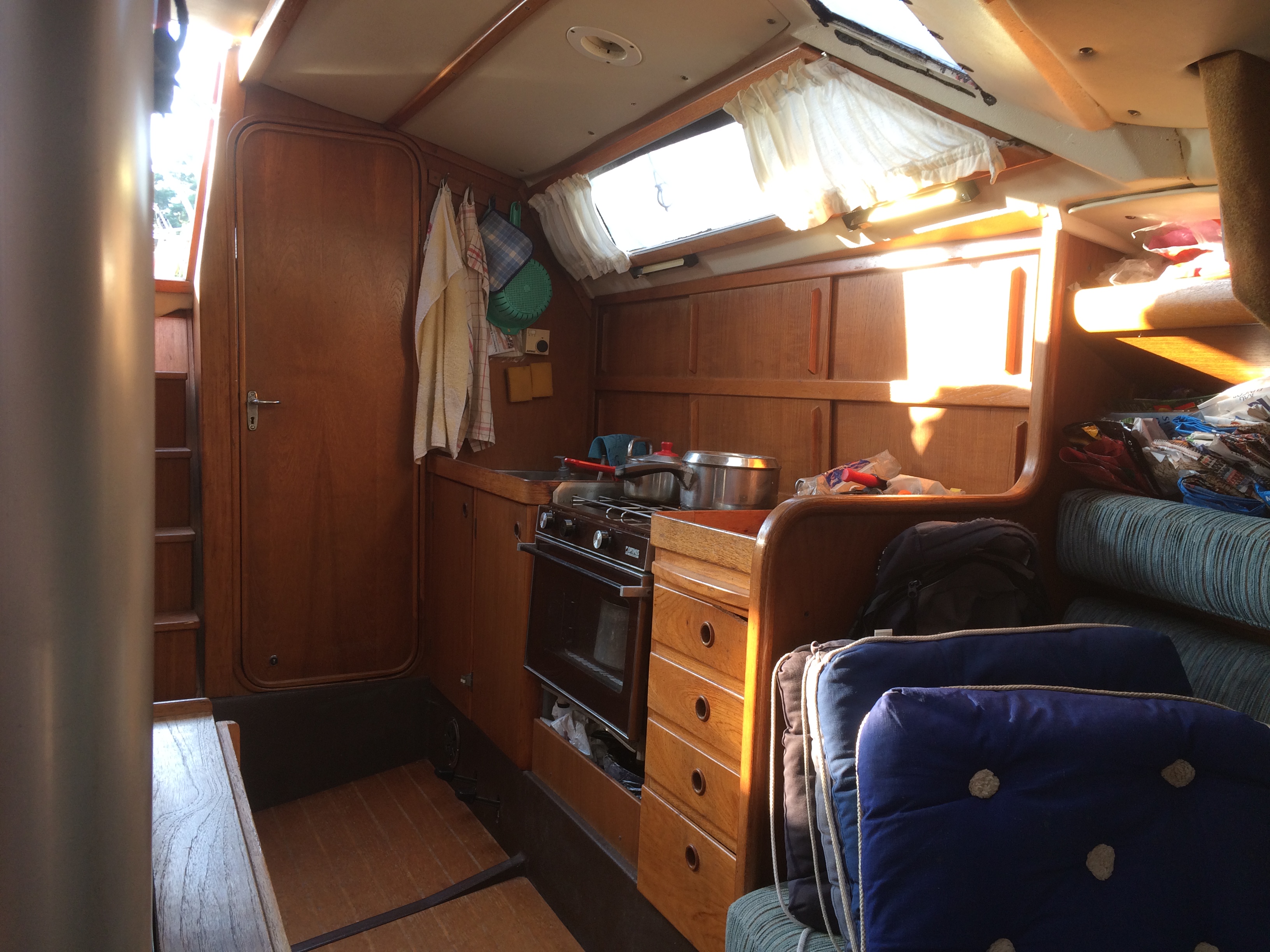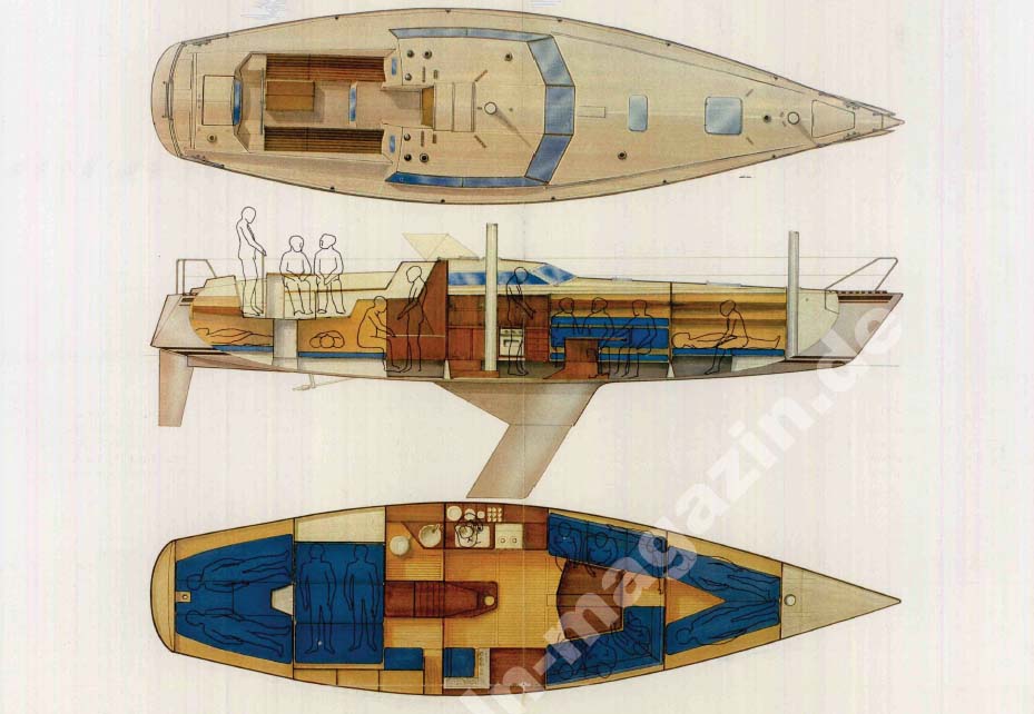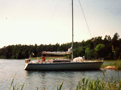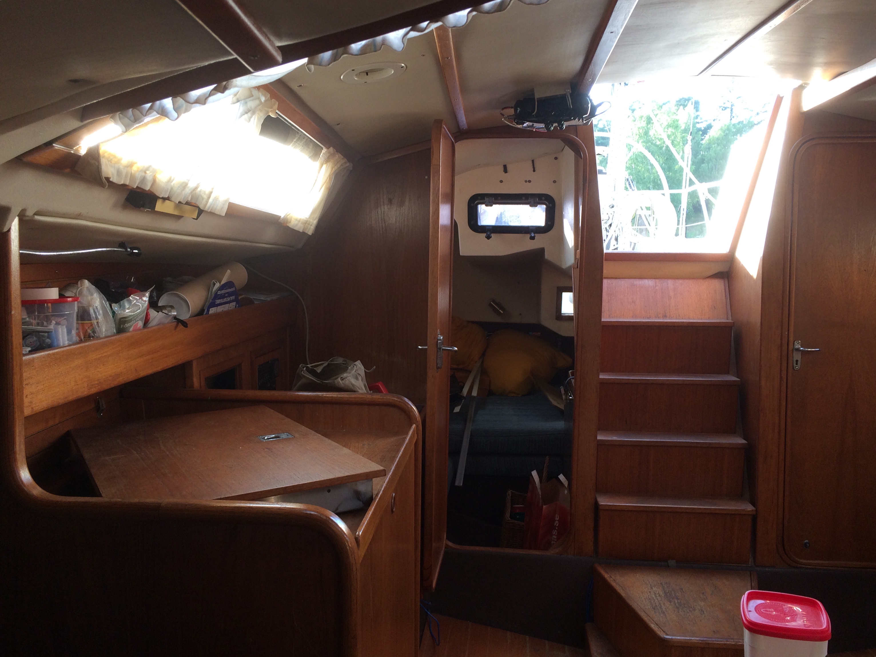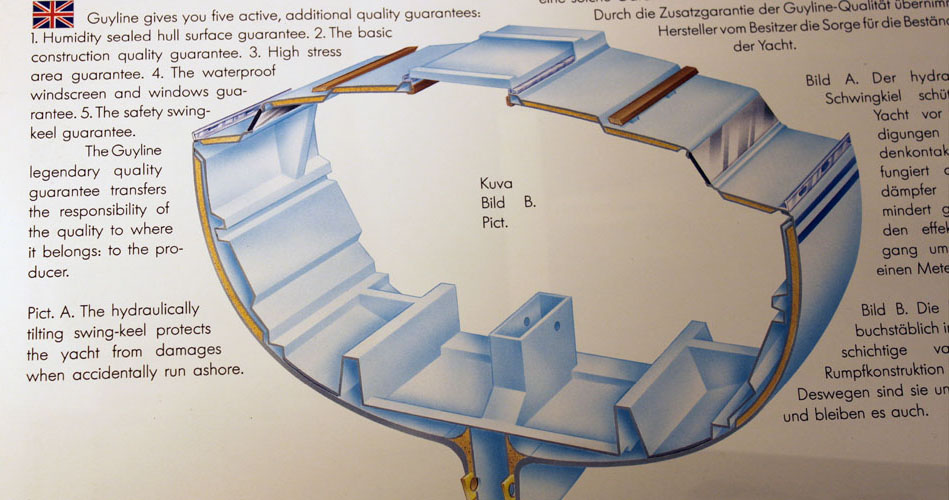 Guys "bästa" båt 125-an. Den väger bara 5,5 ton, men är rymlig som en liten sommarstuga, med tre separata hytter. Owners cabin + 2 kabiner. Alla tre kabinerna för 2 fullvuxna/st. När man är ute på långsegling med familjen, har alla möjlighet att dra sig undan. Guy har trollat med utrymmena som vanligt. Salongen är ovanligt rymlig. Med lite god vilja sitter man 10 personer runt bordet. Öppen fri yta midskepps mellan pentryt och kylboxen. Man kan naturligtvis sova i salongen också. Teakinredning. Fabriksinredd av Bröderna Börjesson. Men det är verkligen ingen klumpig båt - Tvärt om - smäcker och vacker. Lys 1,24. Byggd 1984. 12,5 x 3,3 m plast sandwich. Blyköl. Djupgående 2,3/1,4 m. Manuell hydraulik för fällkölen. Stor sittbrunn. Rymlig toalett med septiktank och däckstömning. Pentry m ugn, gasol. Stor välisolerad kylbox med elektrisk kompressor. Båten är mycket välisolerad med suverän ventilation.
