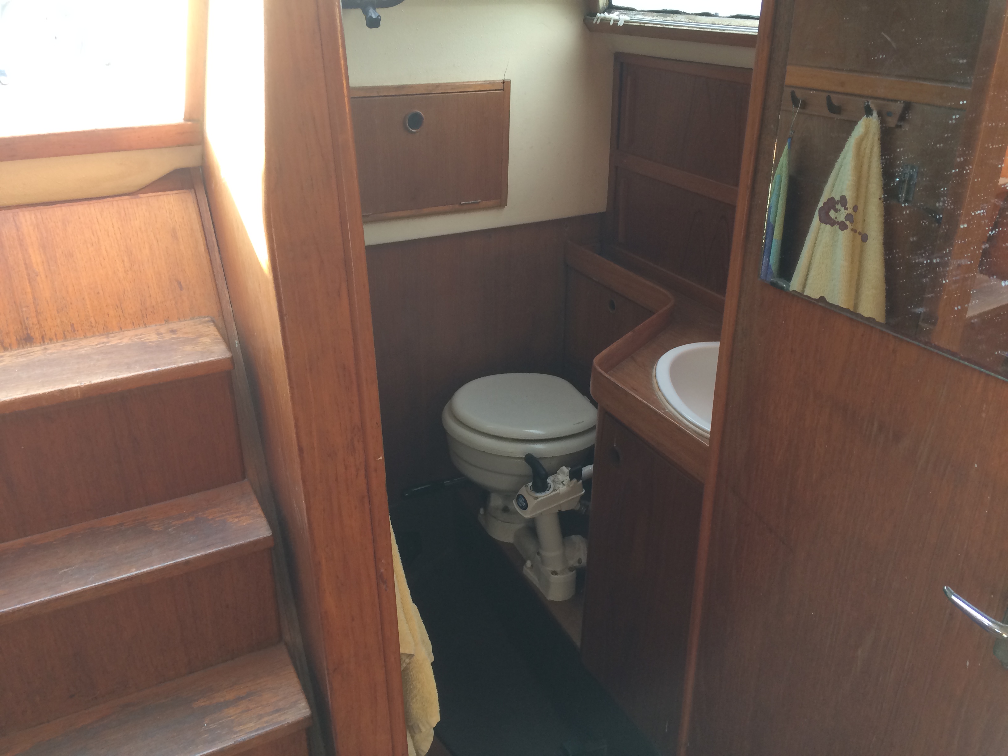 Yanmar 30 hk, sötvattenkyld, har inte många gångtimmar. Motorn används inte så mycket i en sån här välseglande båt.